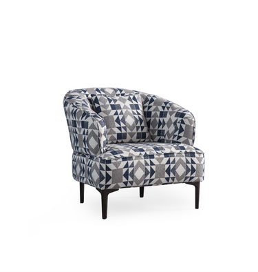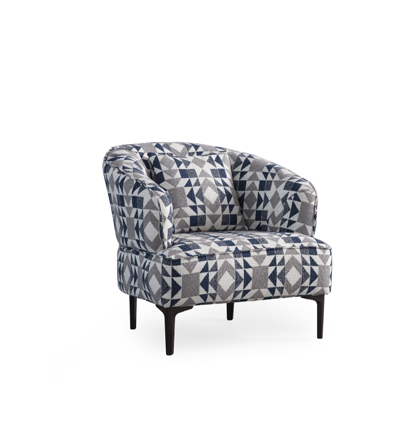 Upholstered in D-811 fabric, the armchair features a dynamic pattern of navy blue, grey, and white triangles, blending seamlessly with both dark and light tones of the main sofa colors. Its supportive structure and plush seating provide an inviting spot for reading, relaxing, or entertaining.